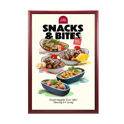 Cost effective, wall mount wood snap frames for small and large signage projects are accentuated with a simulated wood wrap finish and are the ideal choice for many quick change display applications that require an interior touch with a wood finish.