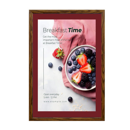 Cost effective, wall mount wood snap frames for small and large signage projects are accentuated with a simulated wood wrap finish and are the ideal choice for many quick change display applications that require an interior touch with a wood finish.