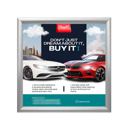 Aluminum Snap Frames 36 x 36 are the most popular changeable poster displays for good reason. Simplicity, variety of snap frame styles and low cost make it an ideal choice for signage framing projects. Frame finishes is another good reason. We offer the popular 36 x 36 poster frame finishes including: satin silver, gold and black frames. Finishes that fit comfortably within numerous interior retail store decors. One snap open 36 x 36 poster display frame or several 36x36 sign frames or thousands of 36x36 frames, “poster snaps” remains the favored choice for small and large businesses, retail stores, corporations, institutions and as a POP signage display frame fixture. Wall mount and snap open your 36 x 36 snap frame, update your 36x36 poster size, and snap shut. That's it!
