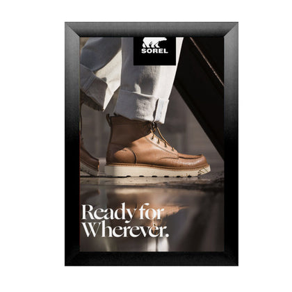 Whatever the application, these oversized, mitered, high quality, front-loading "SwingSnap" wood poster display frames make a popular poster display and sign holder, widely used for trade shows, exhibits, banks, and as store signage fixtures.