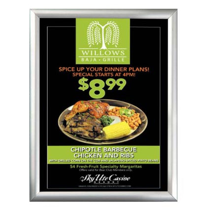 Aluminum Snap Frames 8.5 x 11 are the most popular changeable poster displays for good reason. Simplicity, variety of snap frame styles and low cost make it an ideal choice for signage framing projects. Frame finishes is another good reason. We offer the popular 8.5 x 11 poster frame finishes including: satin silver, gold and black frames. Finishes that fit comfortably within numerous interior retail store decors. One snap open 8.5 x 11 poster display frame or several 8.5x11 sign frames or thousands of 8.5x11 frames, “poster snaps” remains the favored choice for small and large businesses, retail stores, corporations, institutions and as a POP signage display frame fixture. Wall mount and snap open your 8.5 x 11 snap frame, update your 8.5x11 poster size, and snap shut. That's it!