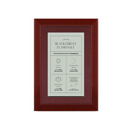 The SwingFrame #353 wood wall mount display frame with matboard effectively presents signage in showrooms, financial institutions, medical centers, as well as restaurants, theatres, and entertainment centers, hotels and resorts and may other interior spaces that need a high quality style that fits any décor.