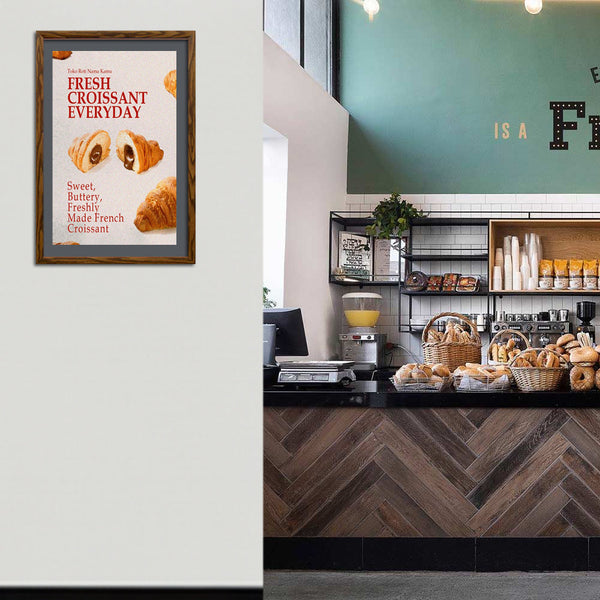 Our same popular SwingSnap poster snap frames with simulated wood wrap now are available with a decorative Mat Board Border. All four sides of the mitered faux wood snap frames 18x18 are spring-loaded to "snap-open". The wall mounted snap frame also described as clip frames or poster grip frames easily snaps down on the Matboard to secure your signage.