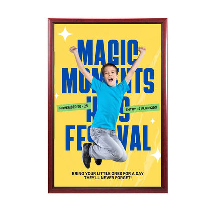 18x24 Frames from SwingFrame with the #362 Wood Frame Profile is Ideal For Retail Stores, Corporations, Institutions, All Industries that require a high quality, changeable framing system for indoor poster and signage projects, and to enhance their interior decor.